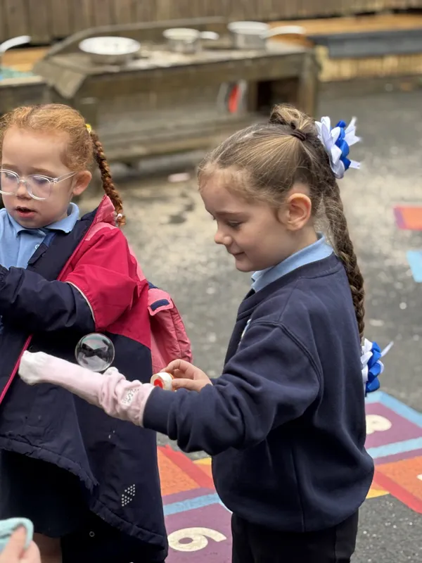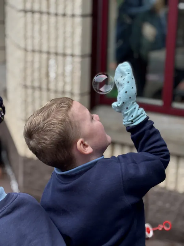 We made 'bouncing bubbles'. We made a special mixture, then put socks on our hands and bounced the bubble.